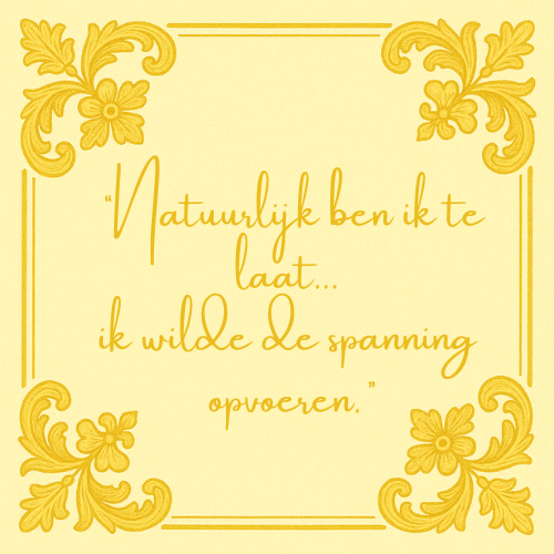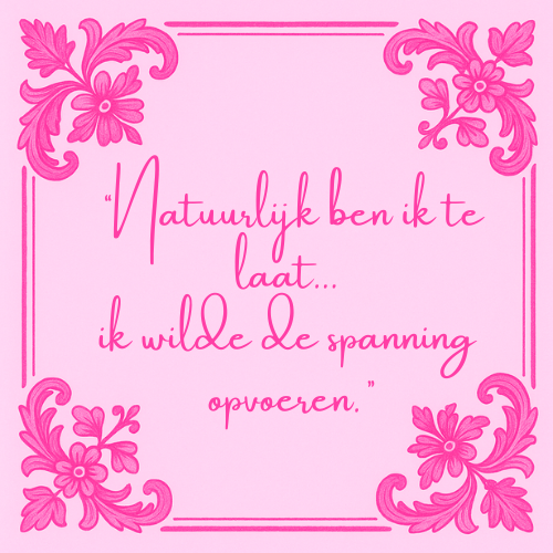 Delft blauw tegeltje met spreuk "Natuurlijk ben ik te laat... ik wilde spanning opvoeren"