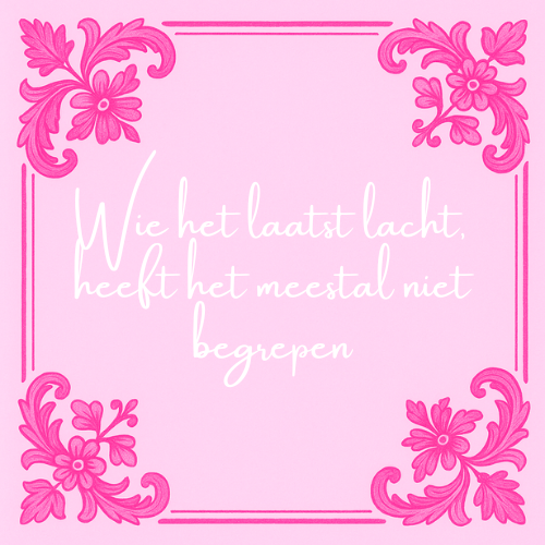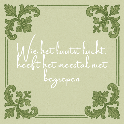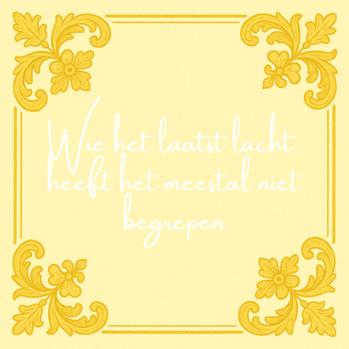 Delft blauw tegeltje met spreuk "Wie het laatst lacht, heeft het meestal niet begrepen